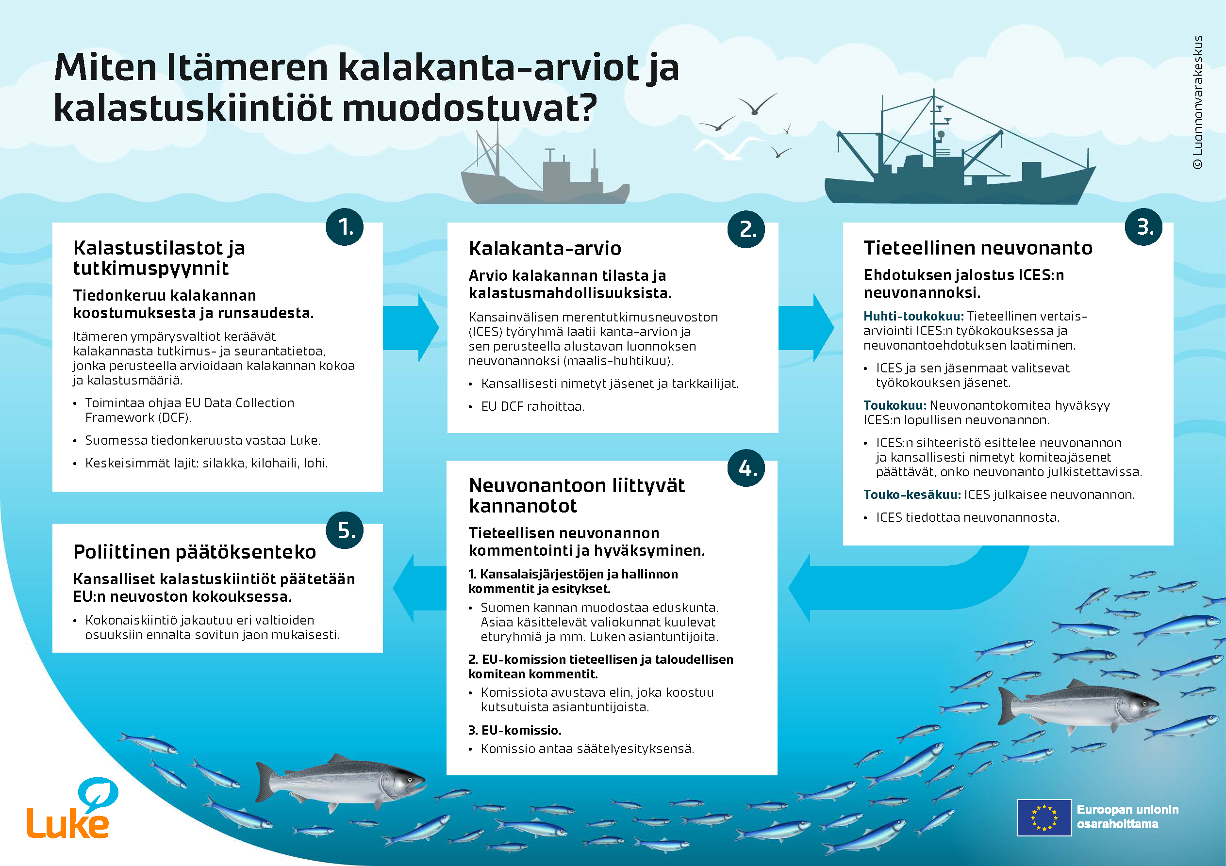 Itämeren kalakanta-arvioiden ja kalastuskiintiöiden muodostumista on kuvattu havainnollisessa kaaviossa. Muun muassa Luke tuottaa tietoa arvioiden pohjaksi. ICES laatii eri maiden keräämien tietoaineistojen pohjalta suosituksen kalastuskiintiöistä. Luken tutkijat osallistuvat ICESin asiantuntijaryhmiin. Lopullinen päätös on poliittinen ja siitä vastaa EU.