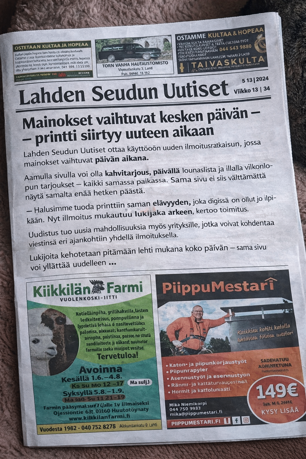 Lahden Seudun Uutiset ottaa käyttöön uuden ilmoitusratkaisun, jossa mainokset vaihtuvat päivän aikana.