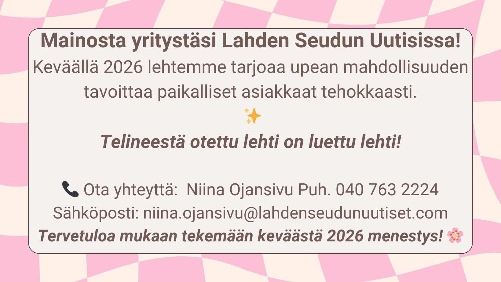 Lahden Seudun Uutiset on vuodesta 2015 ilmestynyt paikallislehti, joka tuo tuoreimmat uutiset ja maukkaimmat puheenaiheet luoksesi kerran kahdessa viikossa. Lehden taustalta löytyy innokas ja aktiivinen tekijäjoukko, joka haluaa kehittyä ja kehittää lehteä aina paremmaksi. Kyseessä on perheyritys, jossa vuonna 2023 ruoriin astui Niina Ojansivu.